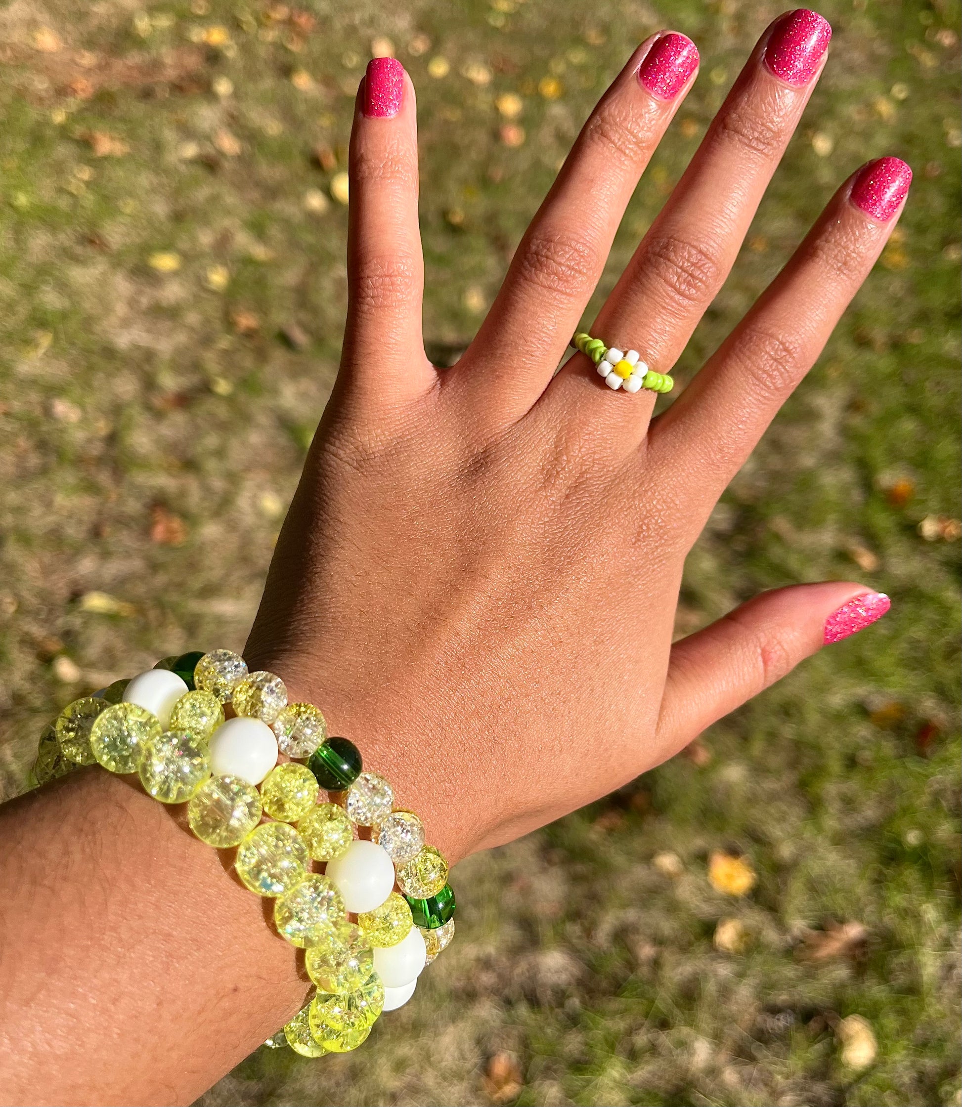 The look is finished with a charming beaded daisy ring, adding a soft touch that perfectly complements the bracelets. Worn together or mixed and matched, this set brings an effortless pop of nature inspired beauty to any outfit.